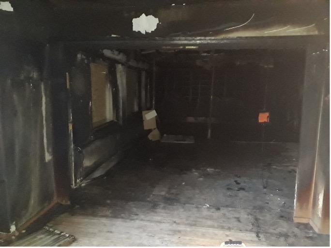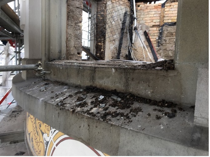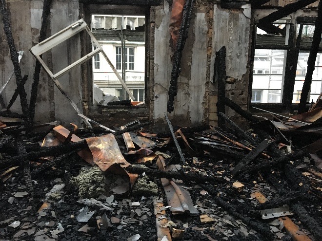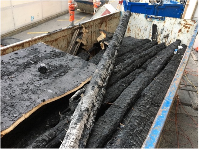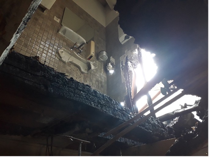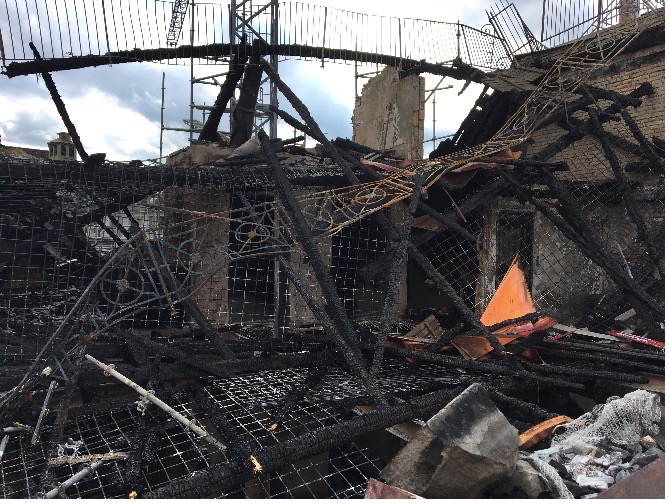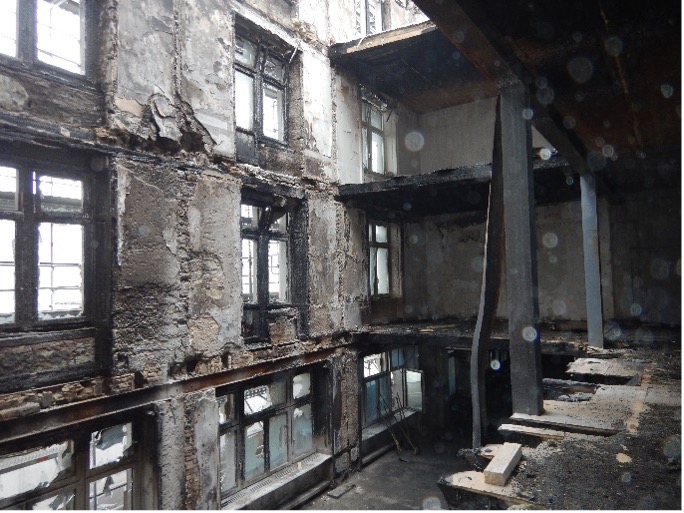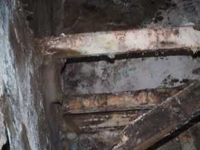 - travi lignee carbonizzate, parti di pareti, di soffitti e della copertura (elementi di laterizio, di calcestruzzo, di acciaio, di gesso),